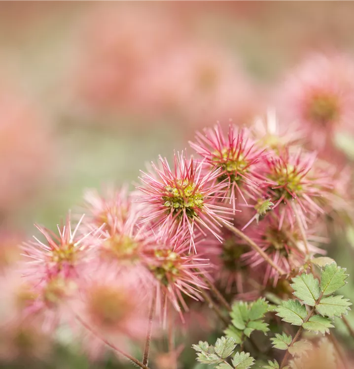 Acaena microphylla bildet ballförmige, cremeweiße Blüten ab Juni.