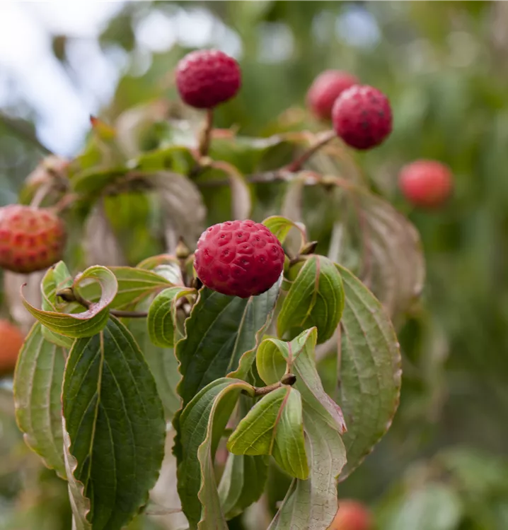 Besonders dekorativ sind die rosaroten, runden Beeren von Cornus kousa. Diese erscheinen ab September.