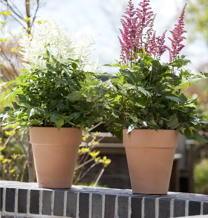 Astilbe x arendsii bildet in Rispen angeordnete, weiße, rosafarbene, rote Blüten ab Juli.