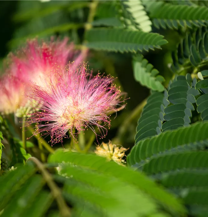 Der Seidenbaum (Albizia julibrissin) ist eine rundliche Gartenpflanze, die rosafarbene Blüten mit einem angenehmen Duft hervorbringt. Sie erscheinen von Juni bis August. Zudem trägt der Seidenbaum, gefiederte, mittelgrüne Blätter. An einem sonnigen, windgeschützten Standort mit durchlässigem Boden erreicht er gewöhnlich eine Höhe von ca. 6 m und wird ca. 6 m breit.
