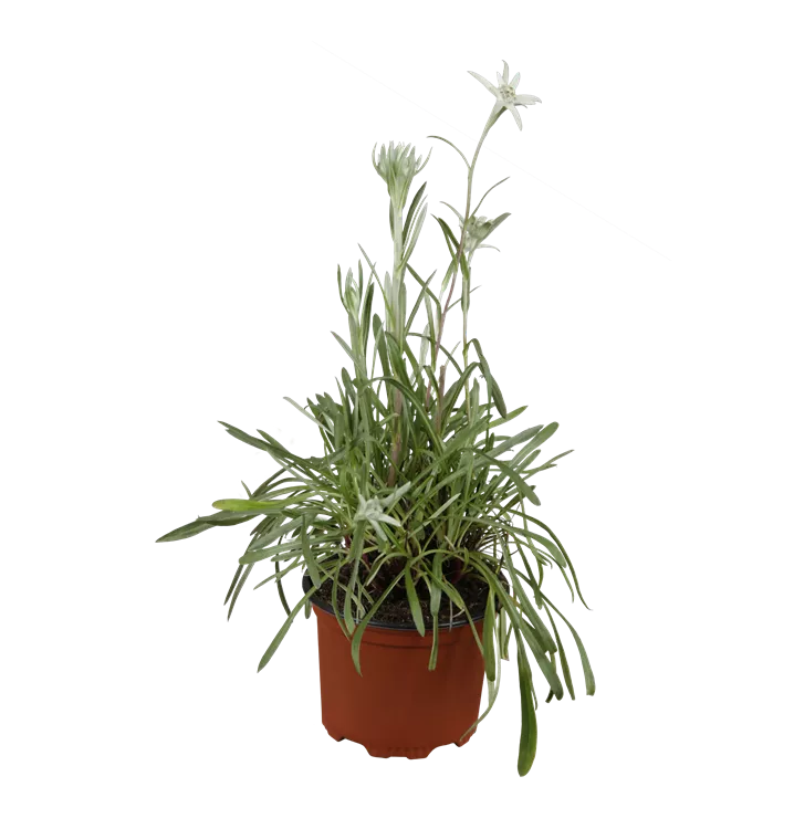 Das Alpen-Edelweiß (Leontopodium alpinum) ist eine polsterbildende Staude, die von Juni bis August silberweiße, sternförmige Blüten bildet. Seine lanzettlichen, Blätter sind silbrig. An einem sonnigen Standort mit durchlässigem, kalkhaltigem, lockerem Boden erreicht es gewöhnlich eine Höhe von ca. 20 cm und wird ca. 20 cm breit. Das Alpen-Edelweiß ist gut frostverträglich.