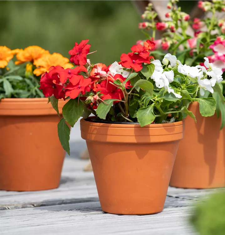 Das Fleißige Lieschen (Impatiens walleriana) ist eine beliebte Pflanze für den Balkon, die während der gesamten Saison unzählige weiße, rosafarbene, rosarote oder rote Blüten bildet. Die dunkelgrünen Blätter sind eiförmig. Ein halbschattiger bis schattiger Standort und ein durchlässiges Substrat werden bevorzugt.