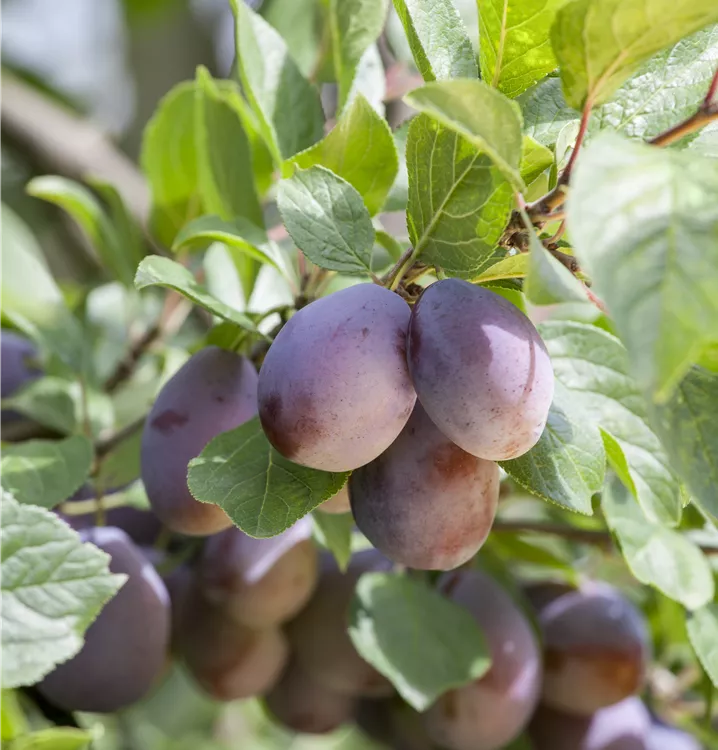Die Zwetschge (Prunus domestica) bildet purpurviolette, blaue Früchte. Sie haben einen süßen, aromatischen Geschmack. Für eine ertragreiche Ernte ab Juli schaffen durchlässiger, humoser Boden und ein sonniger bis halbschattiger Standort optimale Bedingungen. Ihre weißen Blüten sind eine schöne Erscheinung. Die Zwetschge wird mit ihrem buschigen, aufrechten und breiten Wuchs etwa 6 m hoch und 6 m breit.