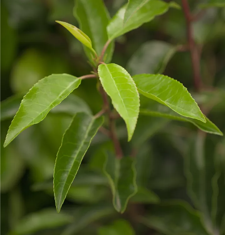 Die immergrünen Blätter der Portugiesische Lorbeerkirsche sind dunkelgrün, lanzettlich, glänzend, wechselständig. Diese sind etwa 6 - 12 cm groß.