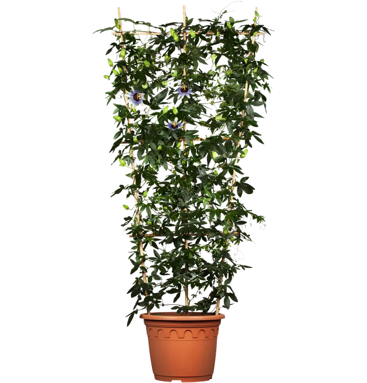 Blaue Passionsblume ist ein Kletterpflanze, welche eine Höhe von 2 - 4 m und eine Breite von 0,6 - 1 m erreichen kann. In der Regel wächst sie 40 - 50 cm pro Jahr.