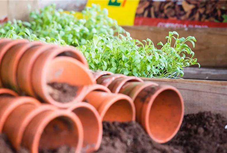 2 Pikiert wird, wenn sich nach den Keimblättern das erste „echte“ Blattpaar zeigt. Mit einem Pikierstab hebt man die kräftigsten Pflänzchen vorsichtig aus der Erde und setzt sie in einen mit leicht gedüngtem Substrat gefüllten Topf. Ist dieser nach einer Weile durchwurzelt, setzt man die Pflanzen in einen neuen Topf, einige Zentimeter tiefer als zuvor, damit sich auch am unteren Haupttrieb Wurzeln bilden, die die Aufnahme von viel Wasser und Nährstoffen gewährleisten.