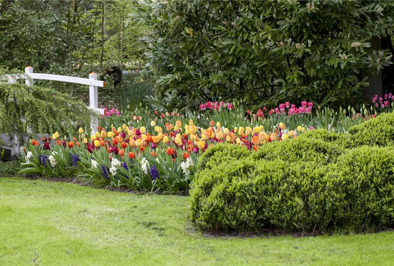 Das richtige Blumenbeet beachtet die Vorliebe des Gartenbesitzers für eine bestimmte Farbe. Warme Rottöne wirken optisch verkürzend, während die kühlen Blautöne ihre Umgebung weitläufiger erscheinen lassen. Für beide gibt es Ergänzungen aus passenden Farbfamilien. Auf ihren Einsatz warten Zwiebel- und Knollenpflanzen wie die zarte Frühlings-Knotenblume, der füllige Hahnenfuß und die traumhafte Amaryllis, auch Exotisches wie die „Sternschnuppe“, ein gladiolenähnliches Schwertliliengewächs. Jetzt noch etwas Immergrünes dazwischen, und das richtige Blumenbeet ist geschaffen. Am besten macht man sich einen Pflanzplan und entscheidet sich dabei auch für die passende Beetumrandung.