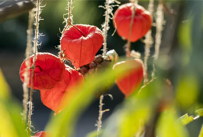 Lampionblumen tragen im Herbst schöne orangene Lampions, die nicht nur im Beet eine gute Figur machen. Aus den kleinen Fruchtblasen (das sind die nämlich) lassen sich eine Menge kreativer Dekorationen herstellen. Dafür braucht es neben den Lampions nur ein paar wenige Materialien: