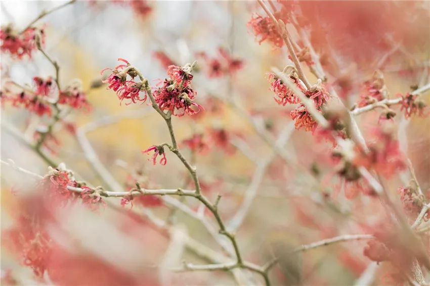 Kommen wir von weißem zu farbigem Flor. Da fällt sofort die Zaubernuss (Hamamelis) ins Auge. Kein Wintertag ist mehr öde und trist, wenn diese bizarre Schönheit blüht. Dieser prachtvolle Anblick war wohl die Ursache dafür, dass die Wünschelrutengänger sich ihre Zweige von dieser Pflanze schnitten, der sich geheimnisvolle Kräfte zusprachen. Lassen Sie eine gelb und eine rot blühende Pflanze ineinander wachsen! Ein weiterer gelber Winterblüher stellt sich mit dem Winterjasmin (Jasminum nudiflorum) vor. Bis in den Herbst hinein glänzt er mit seinem vornehmen Blattwerk, von dem er sich aber zum Winter verabschiedet. Stattdessen bietet er jetzt seine frostharten Blüten an. Auch ein Baum hat sich den frühen Winter für seine Blütezeit ausgesucht. Die Alstonia präsentiert sich am besten in größeren Gärten und Parkanlagen, denn sie wächst recht schnell und wird auch hoch. Er prangt das Jahr über mit seinem imposanten Blattwerk und ziert sich im November mit zarten grün-weißen Blüten.