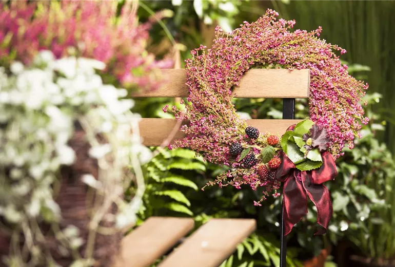 Damit der Kranz auch in die vorhandene Herbstdekoration passt, kommen jetzt noch die Pflanzen zum Einsatz. Die Besenheide knapp oberhalb der Wurzeln von der Pflanze abschneiden und mit Blumendraht am Kranz festbinden. Wenn das abwechselnd auf beiden Seiten gemacht wird, sieht der Krank am Ende schön symmetrisch aus. Um dem Kranz noch mehr Farbe zu verleihen, können zwischen den Heidezweigen noch Zweige von Olive, Eukalyptus oder Lorbeer festgebunden werden. Schleierkraut und Gräser eignen sich übrigens auch sehr gut für den Herbstkranz.